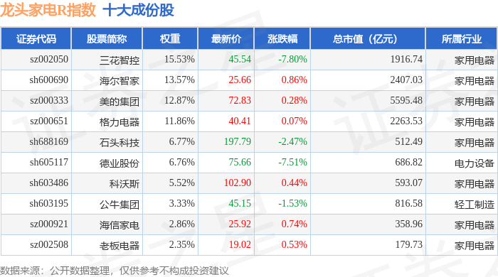 证券之星消息,10月10日,龙头家电R(480028)指数报收于19872.58点,跌1.73%,成交264.51亿元,换手率1.73%。当日该指数成份股中,上涨的有22家,浙江美大以1.39%的涨幅领涨,下跌的有7家,三花智控以7.8%的跌幅领跌。