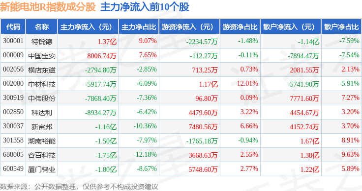 资金流向方面,新能电池R(480032)指数成份股当日主力资金净流出合计179.32亿元,游资资金净流入合计55.03亿元,散户资金净流入合计124.29亿元。成份股资金流向详情见下表: