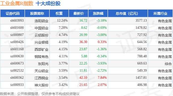 证券之星消息,10月10日,工业金属R(480043)指数报收于3106.82点,跌1.17%,成交877.92亿元,换手率3.81%。当日该指数成份股中,上涨的有15家,白银有色以9.96%的涨幅领涨,下跌的有32家,寒锐钴业以9.41%的跌幅领跌。