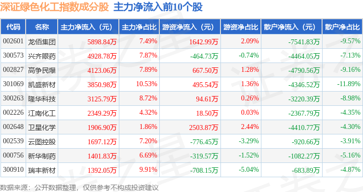 资金流向方面,深证绿色化工(970076)指数成份股当日主力资金净流出合计55.58亿元,游资资金净流入合计18.11亿元,散户资金净流入合计37.48亿元。成份股资金流向详情见下表: