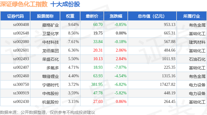 证券之星消息,10月10日,深证绿色化工(970076)指数报收于1618.79点,跌1.0%,成交620.89亿元,换手率2.62%。当日该指数成份股中,上涨的有26家,江南化工以3.63%的涨幅领涨,下跌的有22家,多氟多以7.07%的跌幅领跌。