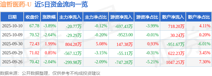 证券之星消息,截至2025年10月10日收盘,迪哲医药(688192)报收于67.78元,下跌3.89%,换手率0.62%,成交量2.54万手,成交额1.75亿元。