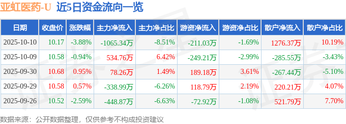 证券之星消息,截至2025年10月10日收盘,亚虹医药(688176)报收于10.17元,下跌3.88%,换手率2.79%,成交量12.15万手,成交额1.25亿元。