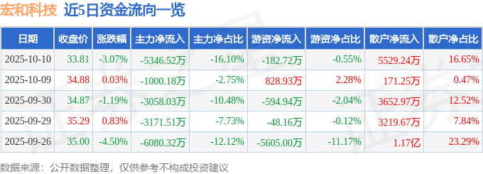 证券之星消息,截至2025年10月10日收盘,宏和科技(603256)报收于33.81元,下跌3.07%,换手率1.11%,成交量9.73万手,成交额3.32亿元。