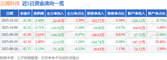 10月10日的资金流向数据方面,主力资金净流入62.41万元,占总成交额2.39%,游资资金净流入165.71万元,占总成交额6.34%,散户资金净流出228.12万元,占总成交额8.72%。