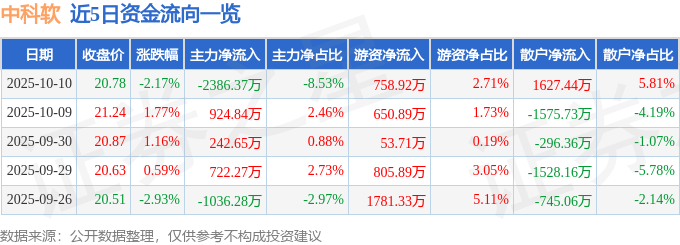 证券之星消息,截至2025年10月10日收盘,中科软(603927)报收于20.78元,下跌2.17%,换手率1.62%,成交量13.42万手,成交额2.8亿元。