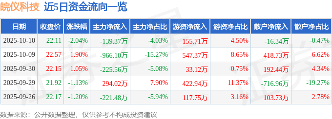 证券之星消息,截至2025年10月10日收盘,皖仪科技(688600)报收于22.11元,下跌2.04%,换手率1.15%,成交量1.55万手,成交额3458.38万元。