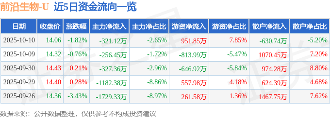 证券之星消息,截至2025年10月10日收盘,前沿生物(688221)报收于14.06元,下跌1.82%,换手率2.29%,成交量8.56万手,成交额1.21亿元。