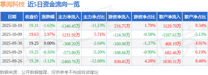 证券之星消息,截至2025年10月10日收盘,掌阅科技(603533)报收于19.31元,下跌1.63%,换手率1.42%,成交量6.24万手,成交额1.21亿元。