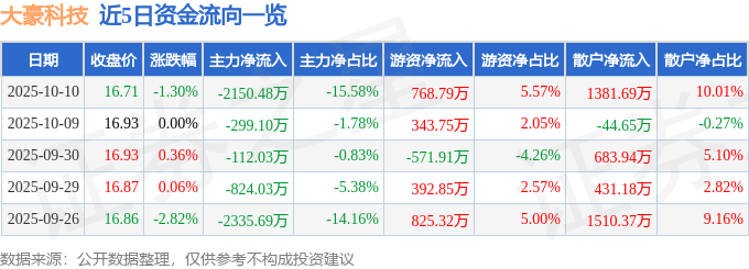 证券之星消息,截至2025年10月10日收盘,大豪科技(603025)报收于16.71元,下跌1.3%,换手率0.74%,成交量8.24万手,成交额1.38亿元。