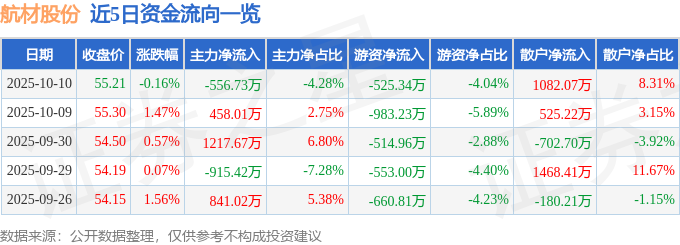 证券之星消息,截至2025年10月10日收盘,航材股份(688563)报收于55.21元,下跌0.16%,换手率2.01%,成交量2.35万手,成交额1.3亿元。