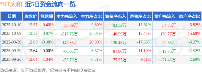 证券之星消息,截至2025年10月10日收盘,*ST太和(605081)报收于12.57元,上涨0.4%,换手率0.42%,成交量4727.0手,成交额598.97万元。