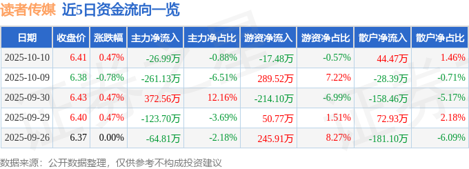 证券之星消息,截至2025年10月10日收盘,读者传媒(603999)报收于6.41元,上涨0.47%,换手率0.83%,成交量4.77万手,成交额3052.36万元。
