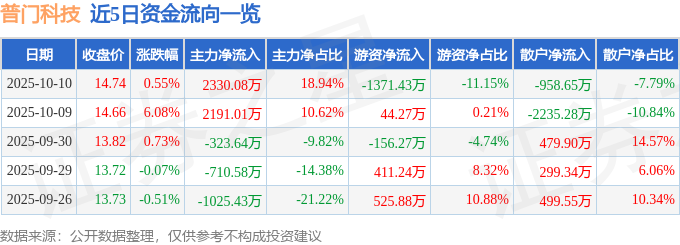10月10日的资金流向数据方面,主力资金净流入2330.08万元,占总成交额18.94%,游资资金净流出1371.43万元,占总成交额11.15%,散户资金净流出958.65万元,占总成交额7.79%。