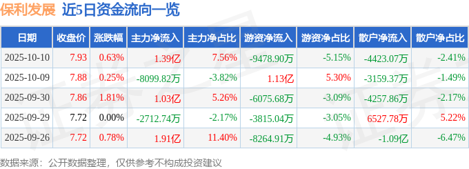 证券之星消息,截至2025年10月10日收盘,保利发展(600048)报收于7.93元,上涨0.63%,换手率1.94%,成交量232.53万手,成交额18.39亿元。
