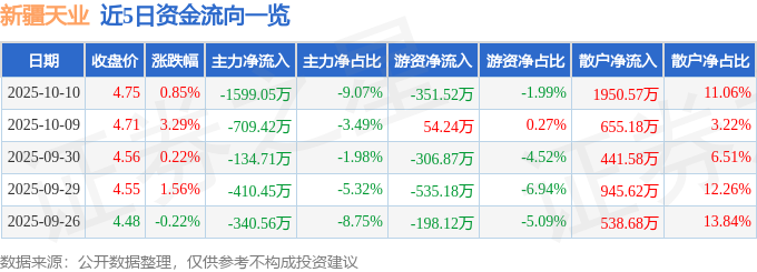 证券之星消息,截至2025年10月10日收盘,新疆天业(600075)报收于4.75元,上涨0.85%,换手率2.17%,成交量37.04万手,成交额1.76亿元。