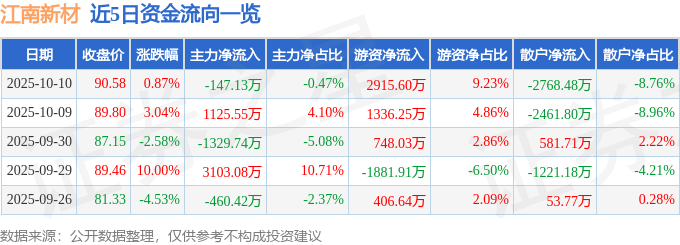 证券之星消息,截至2025年10月10日收盘,江南新材(603124)报收于90.58元,上涨0.87%,换手率11.97%,成交量3.5万手,成交额3.16亿元。