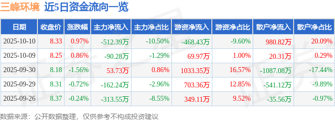 证券之星消息,截至2025年10月10日收盘,三峰环境(601827)报收于8.33元,上涨0.97%,换手率0.35%,成交量5.88万手,成交额4881.41万元。