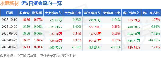 证券之星消息,截至2025年10月10日收盘,永冠新材(603681)报收于16.66元,上涨0.97%,换手率2.86%,成交量5.46万手,成交额9128.61万元。