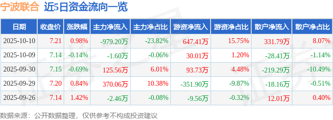 证券之星消息,截至2025年10月10日收盘,宁波联合(600051)报收于7.21元,上涨0.98%,换手率1.83%,成交量5.7万手,成交额4110.68万元。