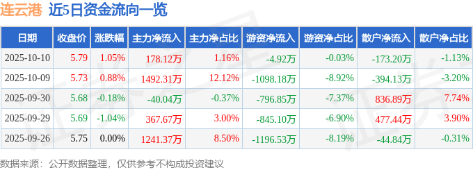 证券之星消息,截至2025年10月10日收盘,连云港(601008)报收于5.79元,上涨1.05%,换手率2.15%,成交量26.62万手,成交额1.54亿元。