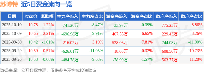 10月10日的资金流向数据方面,主力资金净流出741.26万元,占总成交额8.47%,游资资金净流出33.97万元,占总成交额0.39%,散户资金净流入775.23万元,占总成交额8.86%。