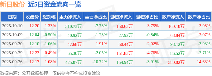证券之星消息,截至2025年10月10日收盘,新日股份(603787)报收于12.2元,上涨1.33%,换手率1.43%,成交量3.3万手,成交额4019.53万元。