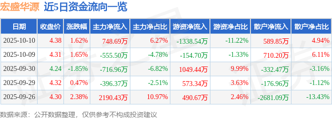 证券之星消息,截至2025年10月10日收盘,宏盛华源(601096)报收于4.38元,上涨1.62%,换手率1.67%,成交量27.4万手,成交额1.19亿元。