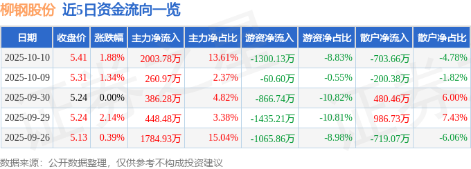 证券之星消息,截至2025年10月10日收盘,柳钢股份(601003)报收于5.41元,上涨1.88%,换手率1.07%,成交量27.33万手,成交额1.47亿元。