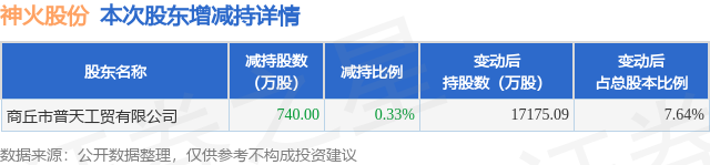证券之星消息,10月10日神火股份发布公告《神火股份:河南神火煤电股份有限公司关于持股5%以上股东减持计划实施完毕的公告》,其股东商丘市普天工贸有限公司于2025年9月13日至2025年10月10日间合计减持740.0万股,占公司目前总股本的0.329%,变动期间该股股价上涨7.98%,截止10月10日收盘报21.65元。