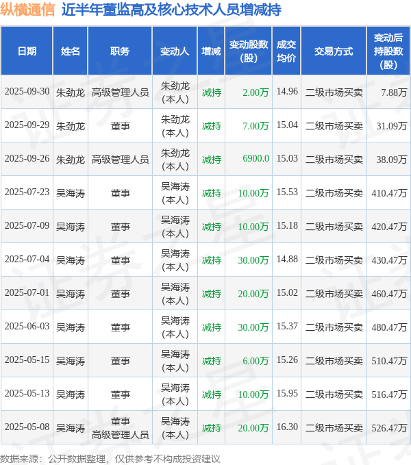 纵横通信近半年内的董监高及核心技术人员增减持详情如下: