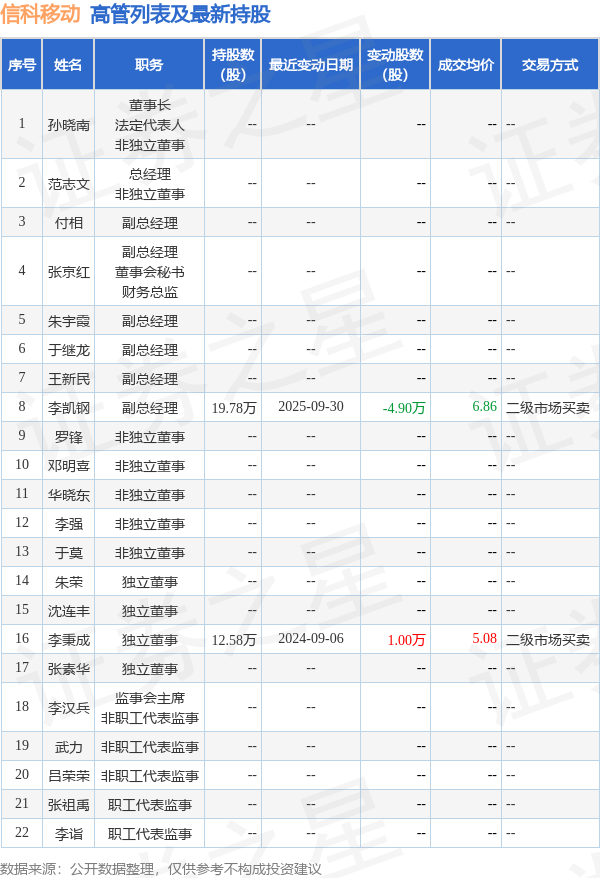 信科移动近半年内的董监高及核心技术人员增减持详情如下: