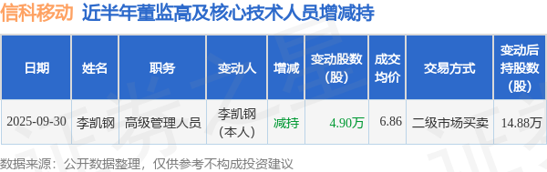 证券之星消息,根据10月10日市场公开信息、上市公司公告及交易所披露数据整理,信科移动(688387)最新董监高及相关人员股份变动情况:2025年9月30日公司高级管理人员李凯钢共减持公司股份4.9万股,占公司总股本为0.0014%。变动期间公司股价上涨3.58%,9月30日当日收盘报6.94元。