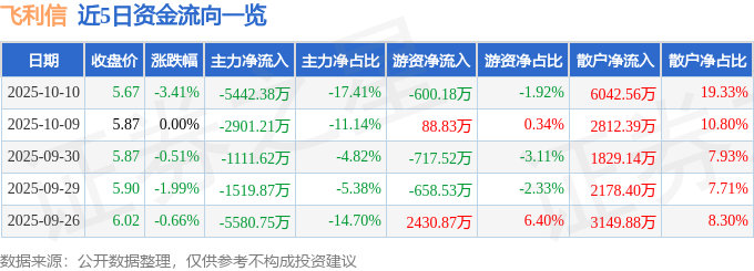 10月10日的资金流向数据方面,主力资金净流出5442.38万元,占总成交额17.41%,游资资金净流出600.18万元,占总成交额1.92%,散户资金净流入6042.56万元,占总成交额19.33%。