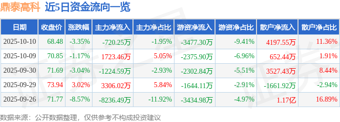 证券之星消息,截至2025年10月10日收盘,鼎泰高科(301377)报收于68.48元,下跌3.35%,换手率7.49%,成交量5.32万手,成交额3.69亿元。