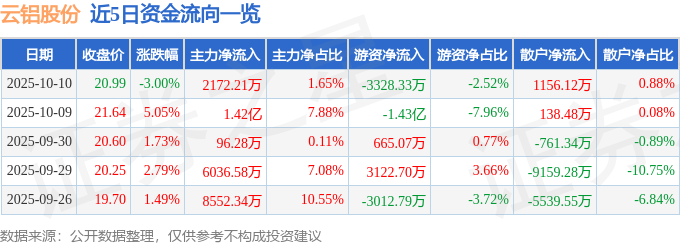证券之星消息,截至2025年10月10日收盘,云铝股份(000807)报收于20.99元,下跌3.0%,换手率1.8%,成交量62.37万手,成交额13.19亿元。