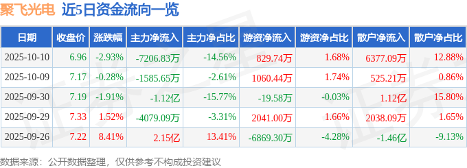 证券之星消息,截至2025年10月10日收盘,聚飞光电(300303)报收于6.96元,下跌2.93%,换手率5.33%,成交量70.73万手,成交额4.95亿元。