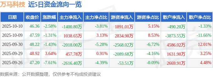 证券之星消息,截至2025年10月10日收盘,万马科技(300698)报收于46.36元,下跌2.58%,换手率6.58%,成交量7.8万手,成交额3.67亿元。