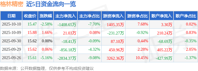 证券之星消息,截至2025年10月10日收盘,格林精密(300968)报收于15.47元,下跌2.58%,换手率2.86%,成交量11.82万手,成交额1.83亿元。