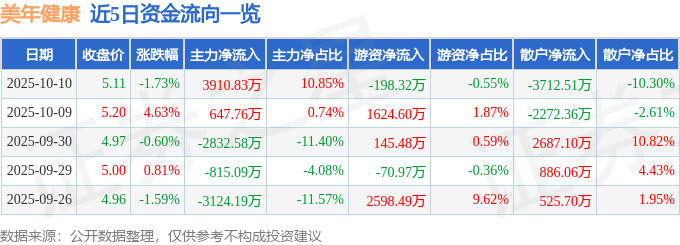 证券之星消息,截至2025年10月10日收盘,美年健康(002044)报收于5.11元,下跌1.73%,换手率1.81%,成交量70.15万手,成交额3.6亿元。