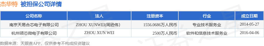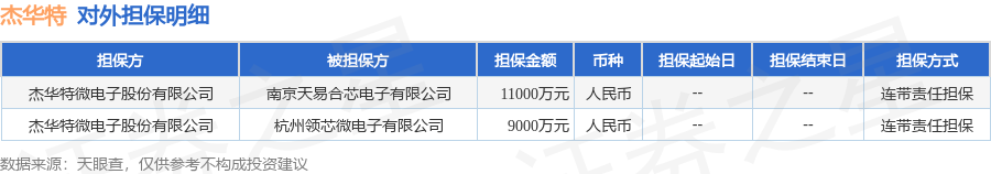 杰华特10月9日披露2笔对外担保,被担保公司2家。对外担保明细如下表:
