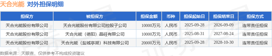 天合光能10月9日披露3笔对外担保,被担保公司3家。对外担保明细如下表: