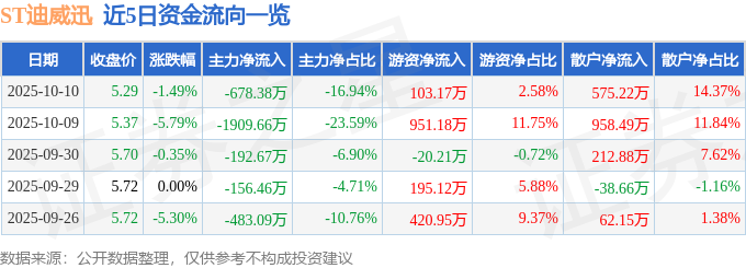 证券之星消息,截至2025年10月10日收盘,ST迪威迅(300167)报收于5.29元,下跌1.49%,换手率2.07%,成交量7.45万手,成交额4004.0万元。