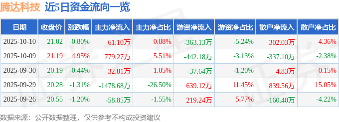 证券之星消息,截至2025年10月10日收盘,腾达科技(001379)报收于21.02元,下跌0.8%,换手率4.87%,成交量3.28万手,成交额6927.1万元。