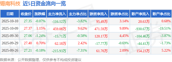 证券之星消息,截至2025年10月10日收盘,锡南科技(301170)报收于27.35元,下跌0.07%,换手率3.3%,成交量1.11万手,成交额3036.42万元。