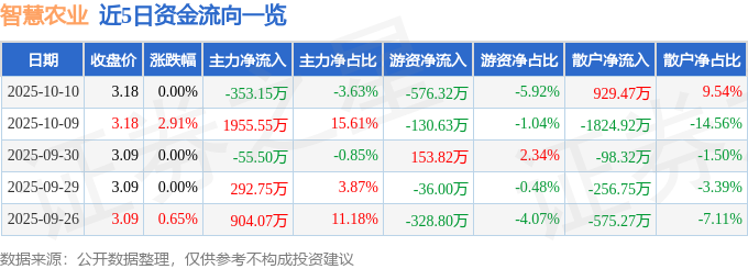 证券之星消息,截至2025年10月10日收盘,智慧农业(000816)报收于3.18元,上涨0.0%,换手率2.14%,成交量30.67万手,成交额9738.51万元。