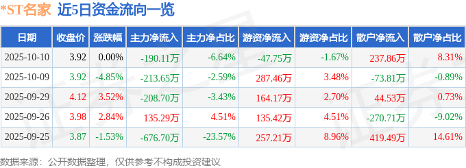 证券之星消息,截至2025年10月10日收盘,*ST名家(300506)报收于3.92元,上涨0.0%,换手率1.12%,成交量7.32万手,成交额2863.63万元。