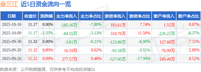 10月10日的资金流向数据方面,主力资金净流出185.16万元,占总成交额7.8%,游资资金净流入183.61万元,占总成交额7.74%,散户资金净流入1.55万元,占总成交额0.07%。