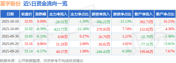 10月10日的资金流向数据方面,主力资金净流出26.52万元,占总成交额1.1%,游资资金净流出366.22万元,占总成交额15.13%,散户资金净流入392.73万元,占总成交额16.23%。