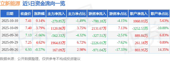证券之星消息,截至2025年10月10日收盘,立新能源(001258)报收于7.41元,上涨0.14%,换手率2.73%,成交量25.5万手,成交额1.88亿元。